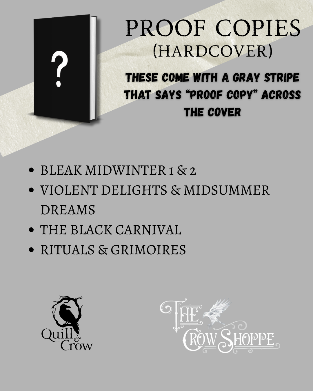 DIRECTIONS: Simply order the product, and when you get to the cart, please let me know which books you’d like in the “Cart Note.” Any questions please email qandccrowshoppe@gmail.com