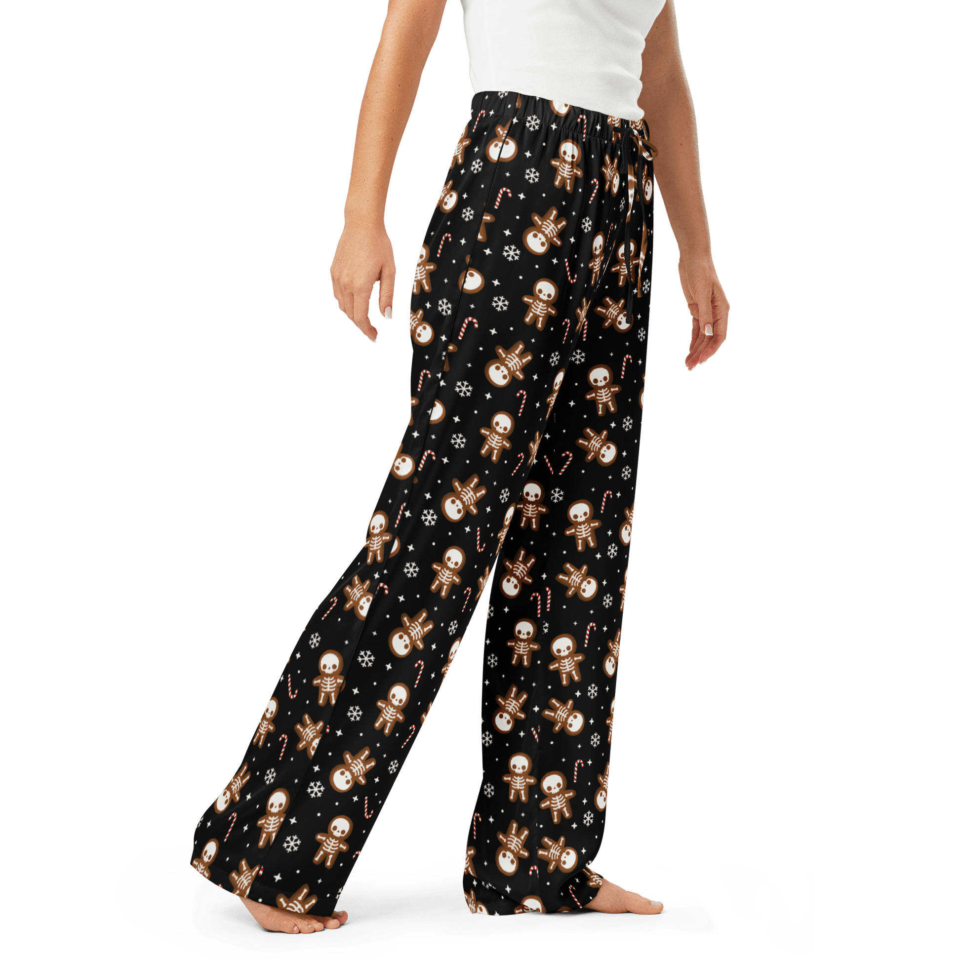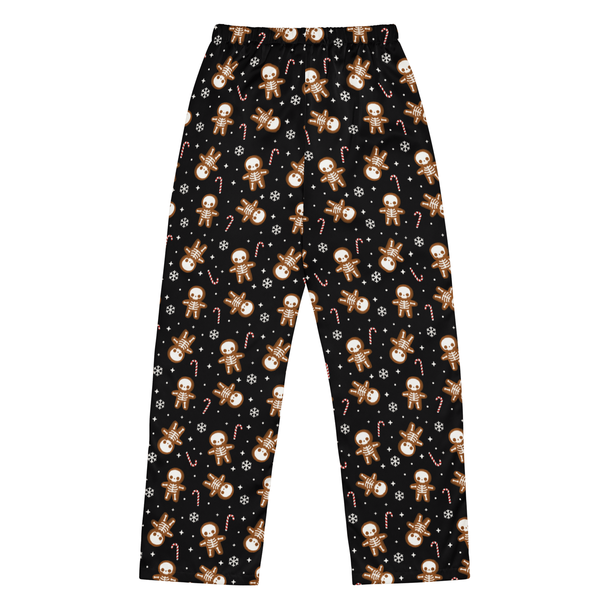 Get cozy with a darkly festive flair in the Gingerdead Men Silky Pajama Pants. Featuring skeleton gingerbread men and candy canes, these silky bottoms make spooky season last all year.