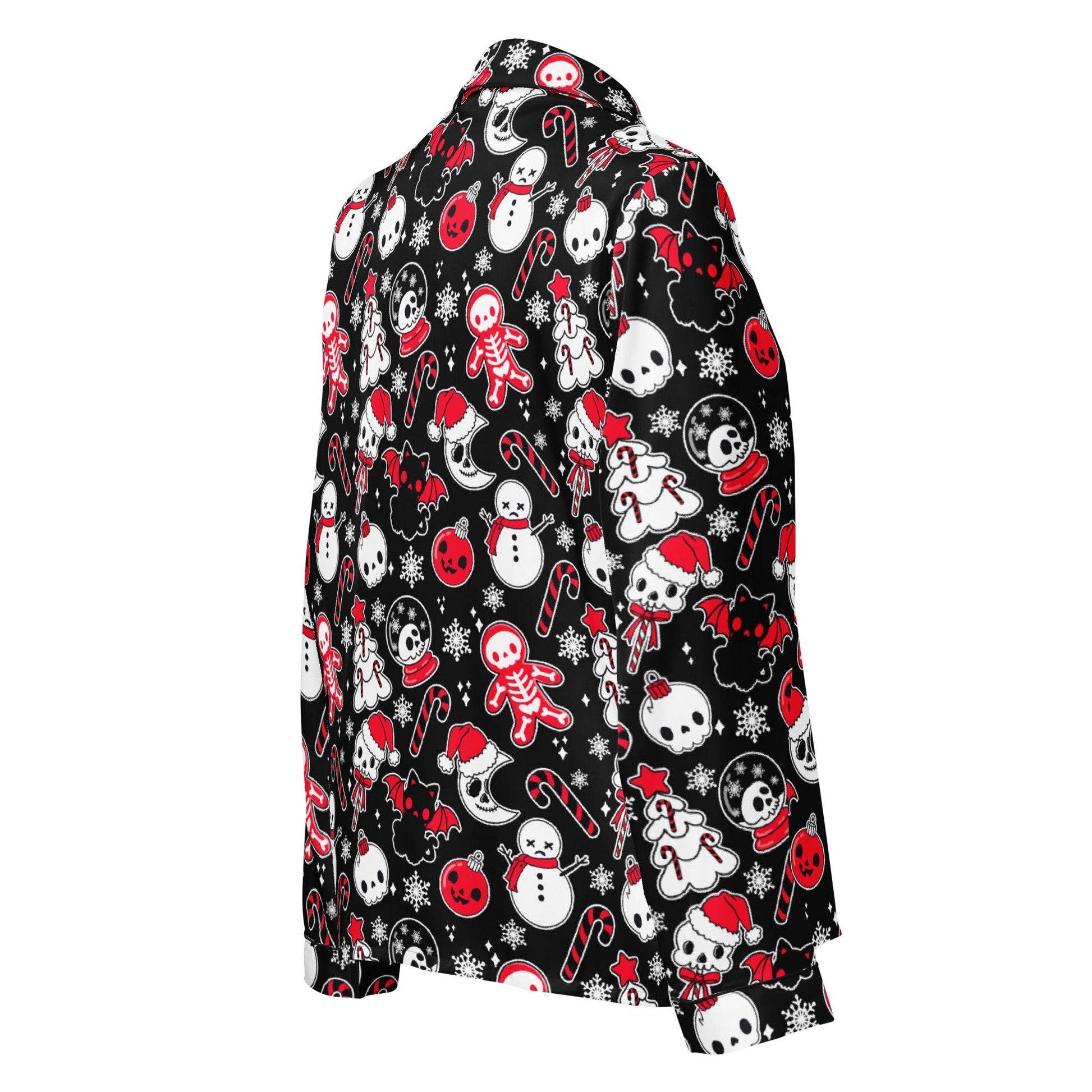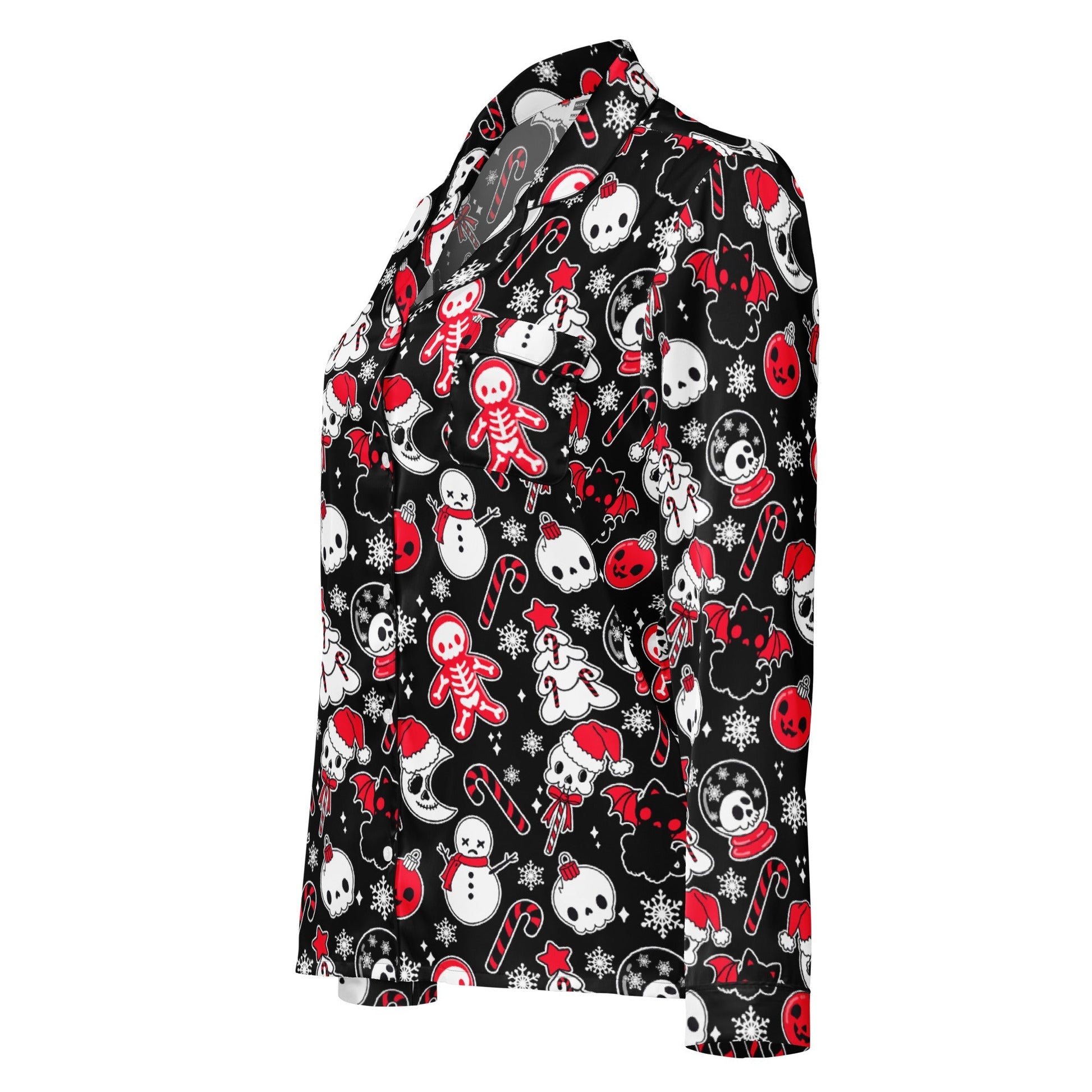 Get cozy in spooky style with the Helliday Cheer Silky Pajama Top. Featuring skeleton gingerbread men, skull ornaments, and eerie candy canes, this silky long sleeve top brings haunted holiday vibes to your loungewear.