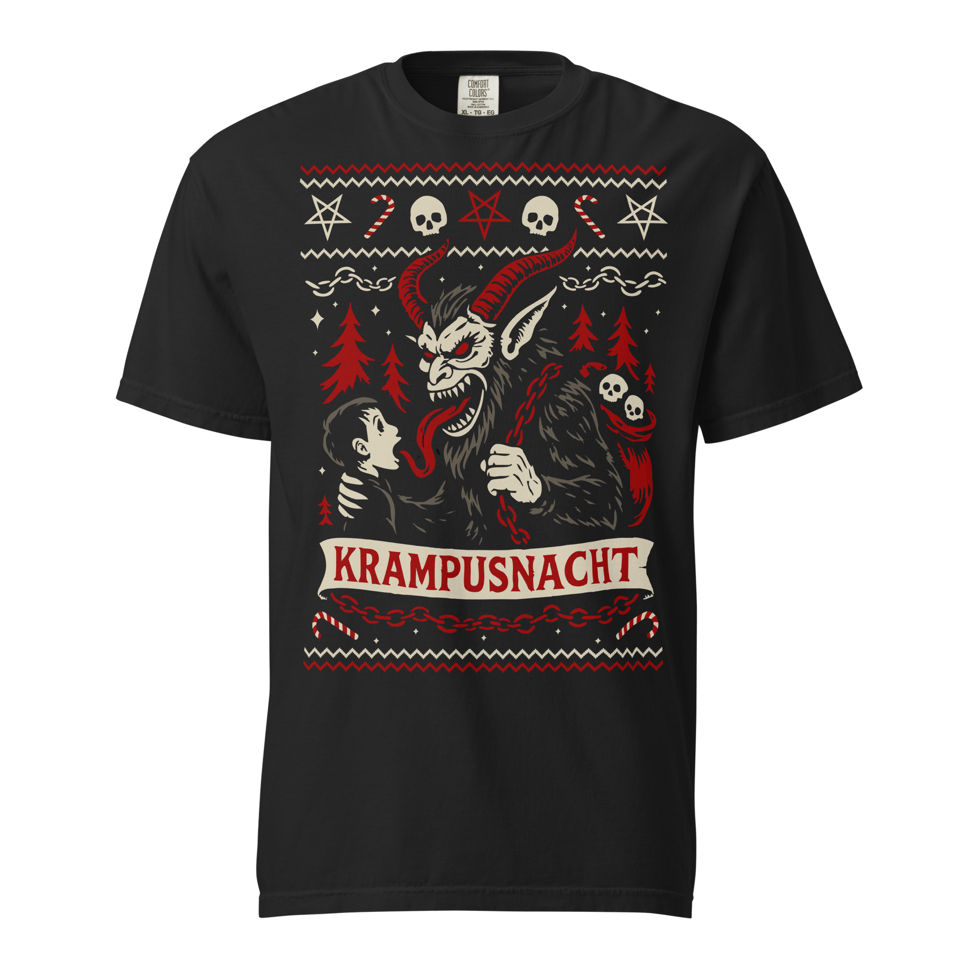A dark holiday classic—our Krampusnacht tee features a vintage Krampus holding a child, ready to feast. Soft, thick cotton keeps you comfy while serving spooky seasonal energy.