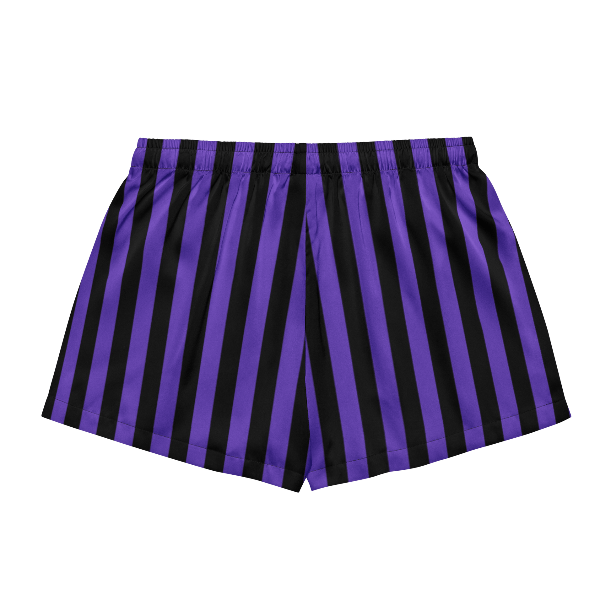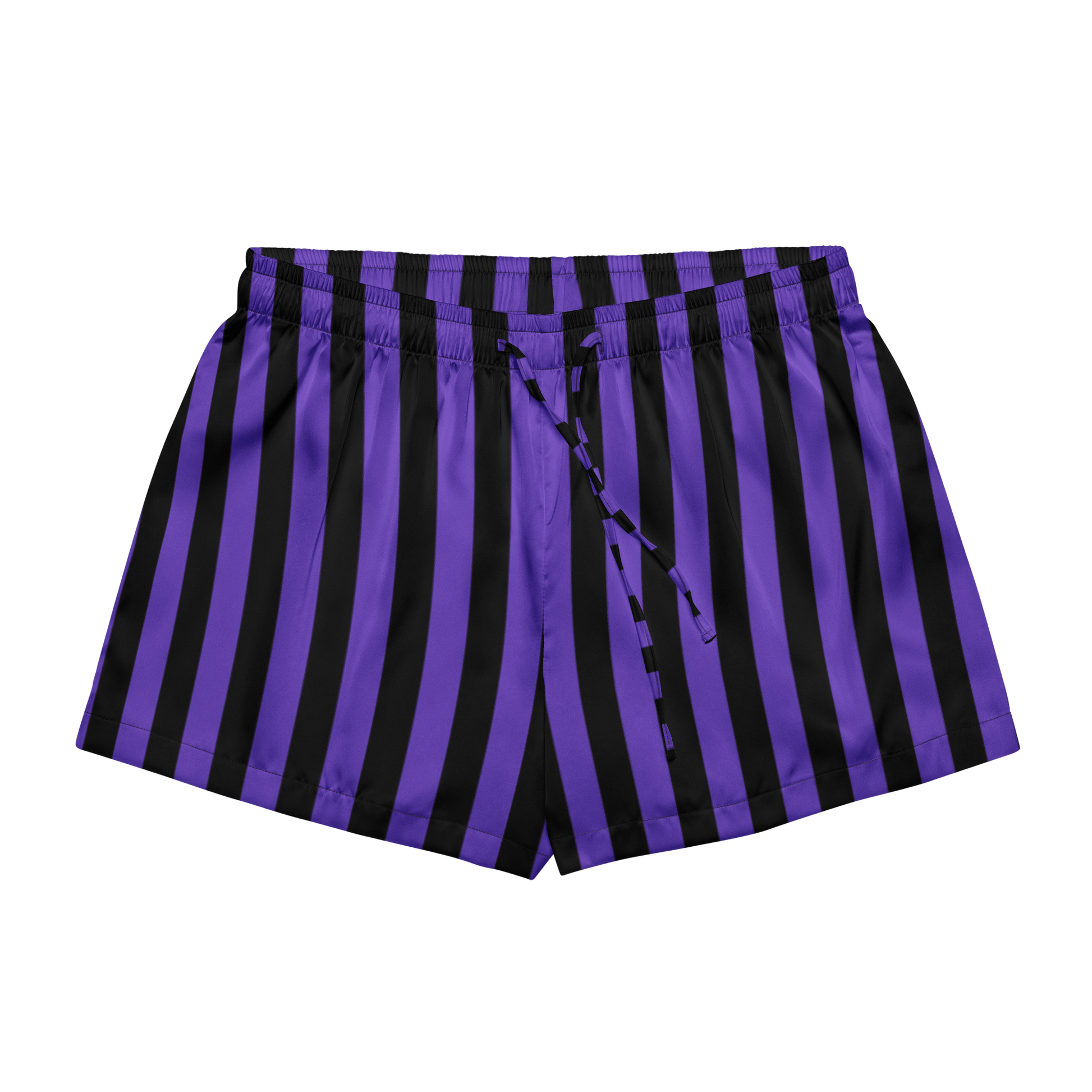 Slip into comfort with these silky pajama shorts featuring black and blue/purple stripes inspired by the Nevermore Academy uniforms from Netflix’s Wednesday. Crafted from 100% premium polyester, these silky-soft shorts offer a relaxed fit with adjustable drawstrings and chic piping details. Perfect for lounging, sleeping, or adding a gothic twist to your downtime style.