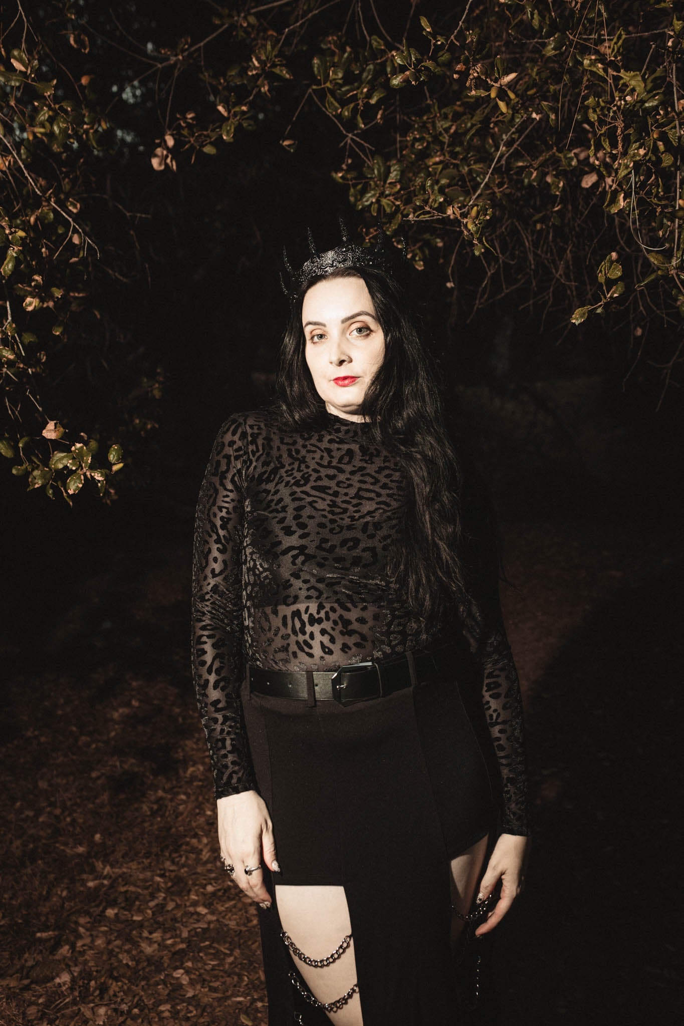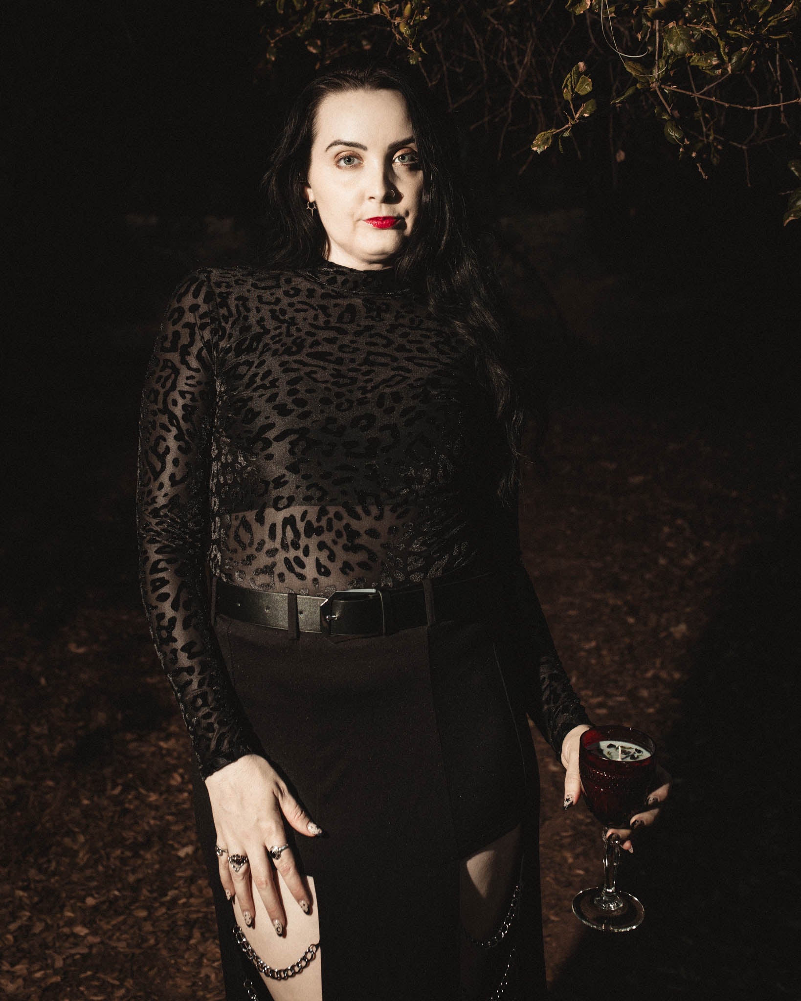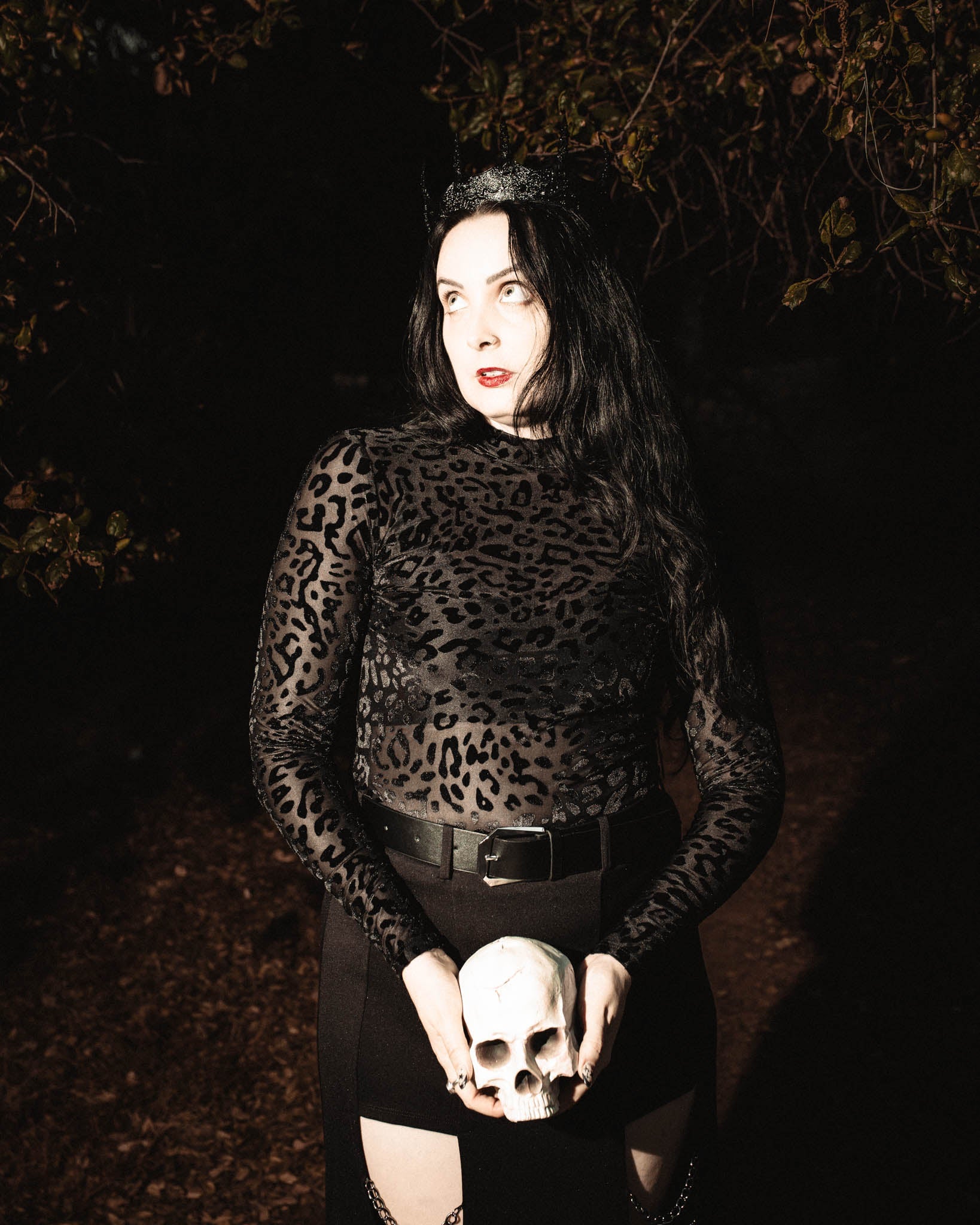 This stretchy burn out velvet piece is made of black on black leopard print and contains a mock neck. Made in collaboration with Kittie.