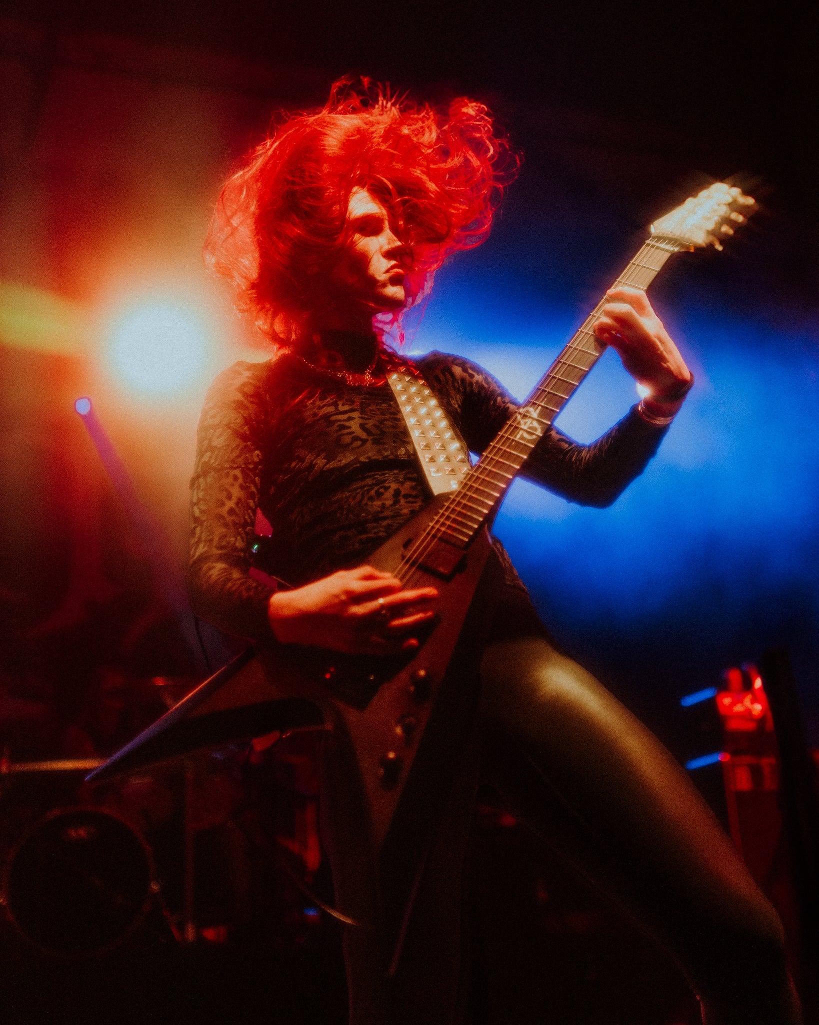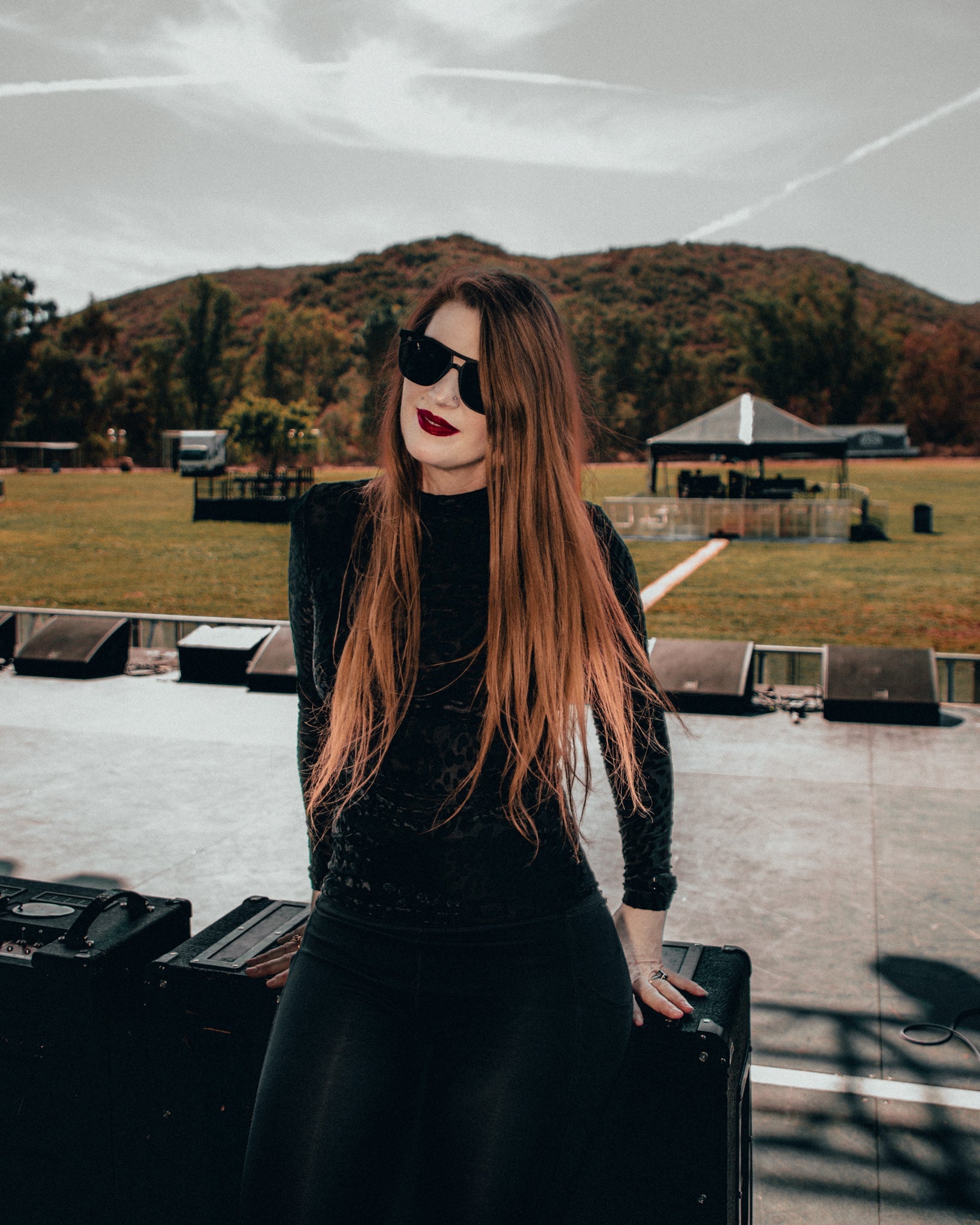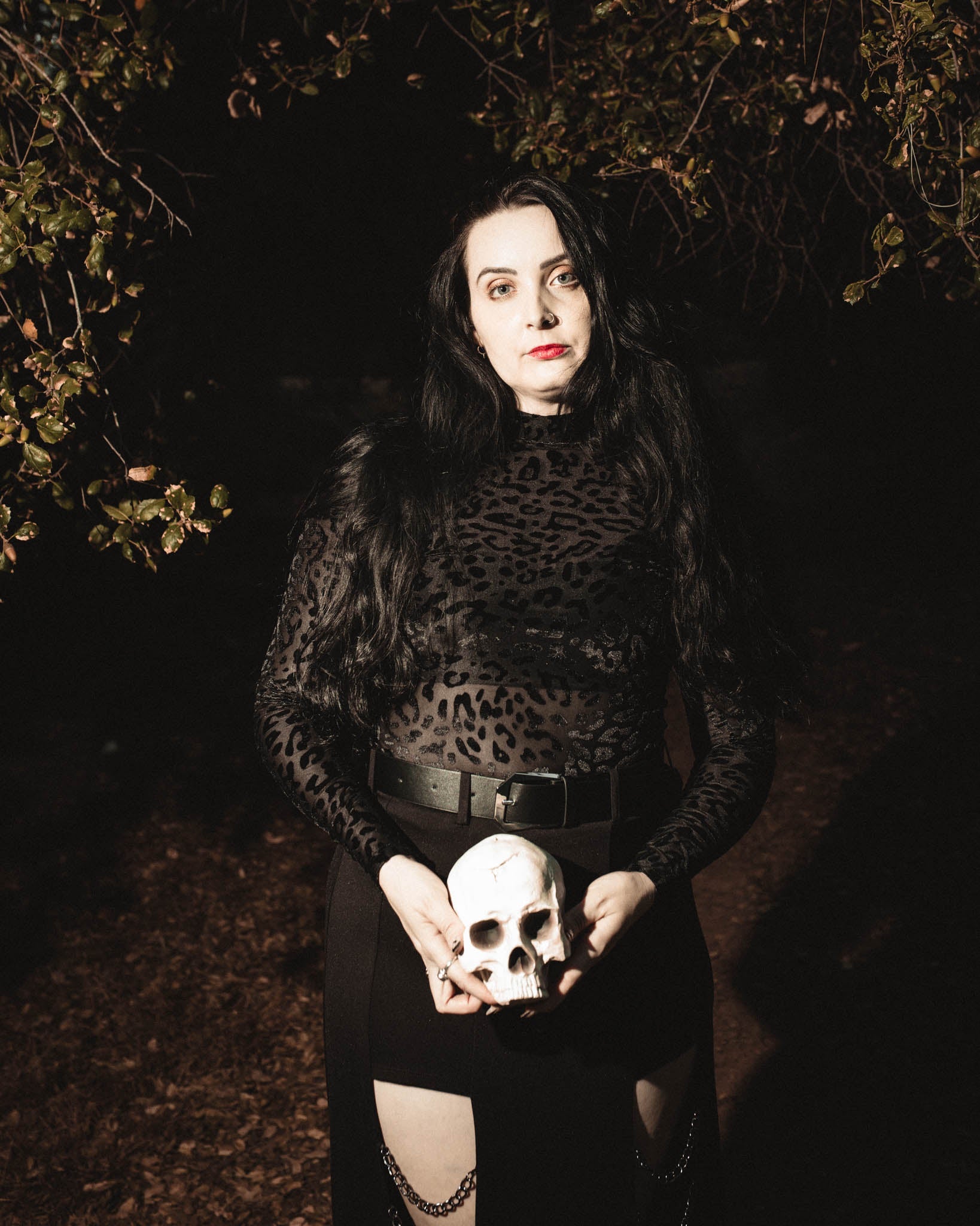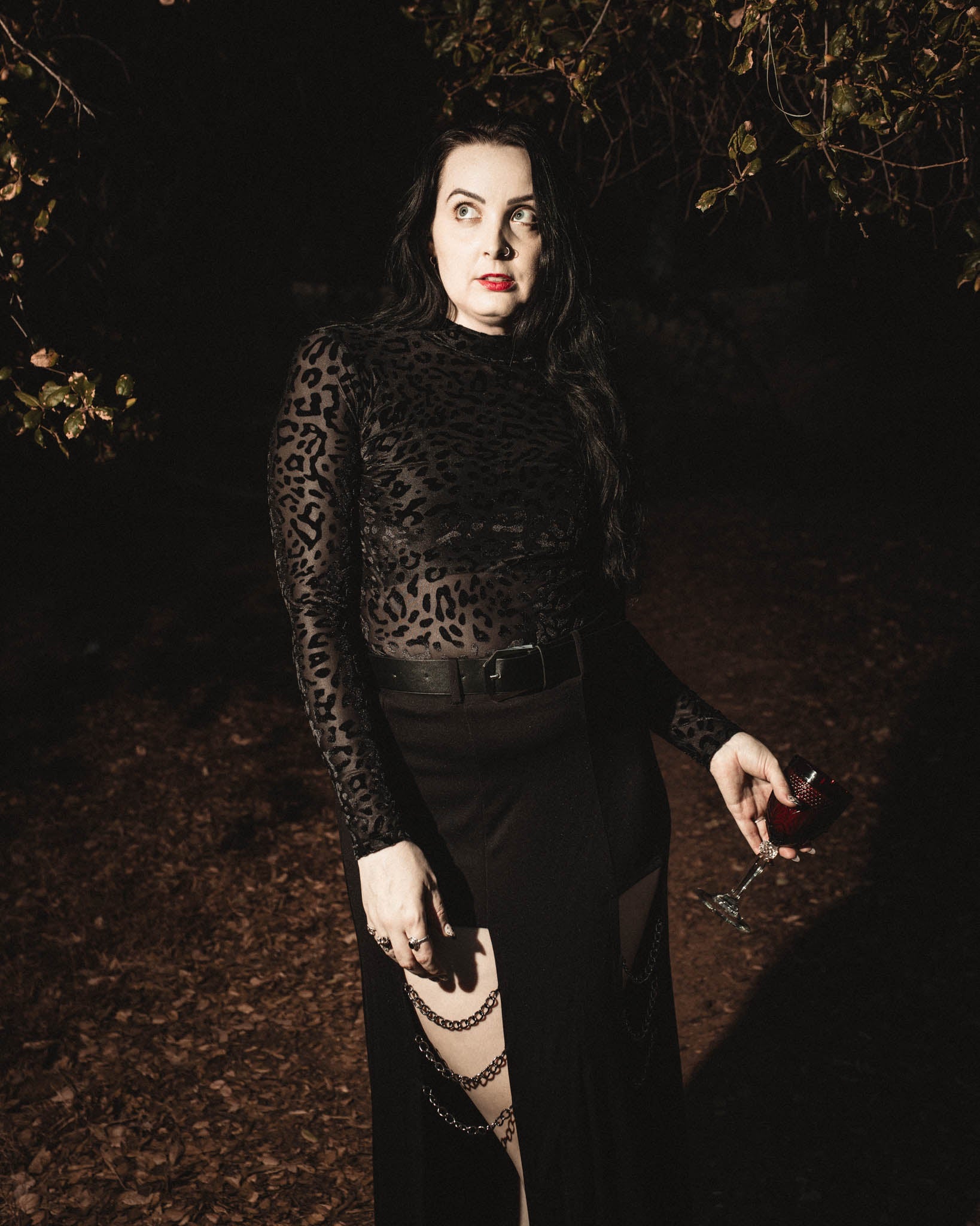 This stretchy burn out velvet piece is made of black on black leopard print and contains a mock neck. Made in collaboration with Kittie.