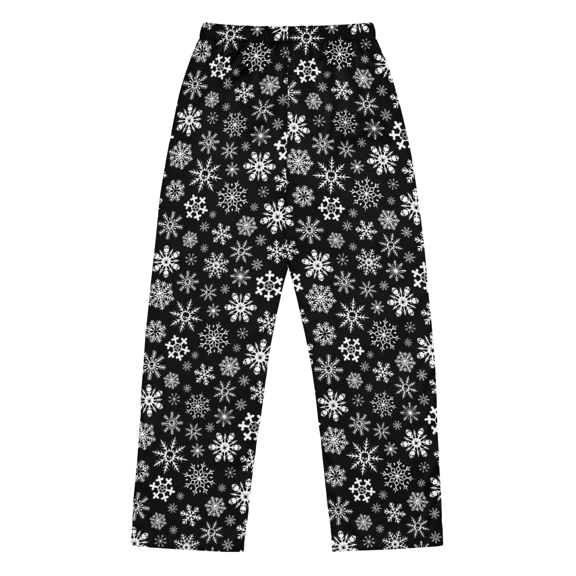 The Skulldrift Silky Pajama Pants feature a hauntingly detailed pattern of skulls, spiders, and crosses hidden in snowflakes. Cozy, silky, and perfectly spooky for the season.