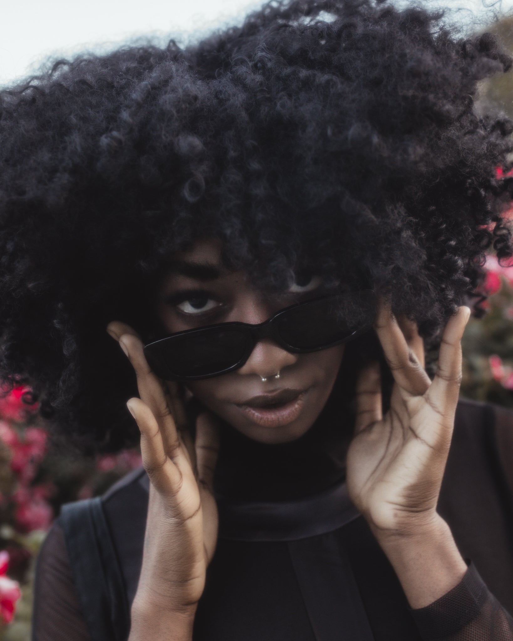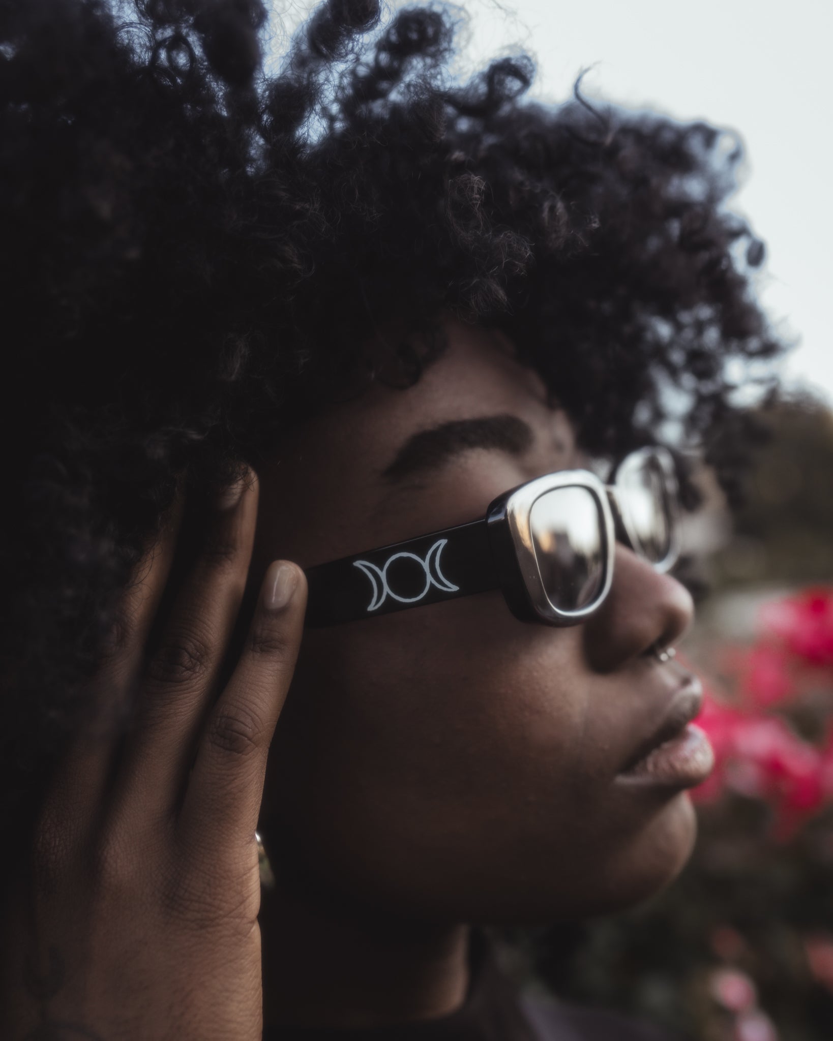 Shiny black triple moon sunglasses, subtle but also extra af.