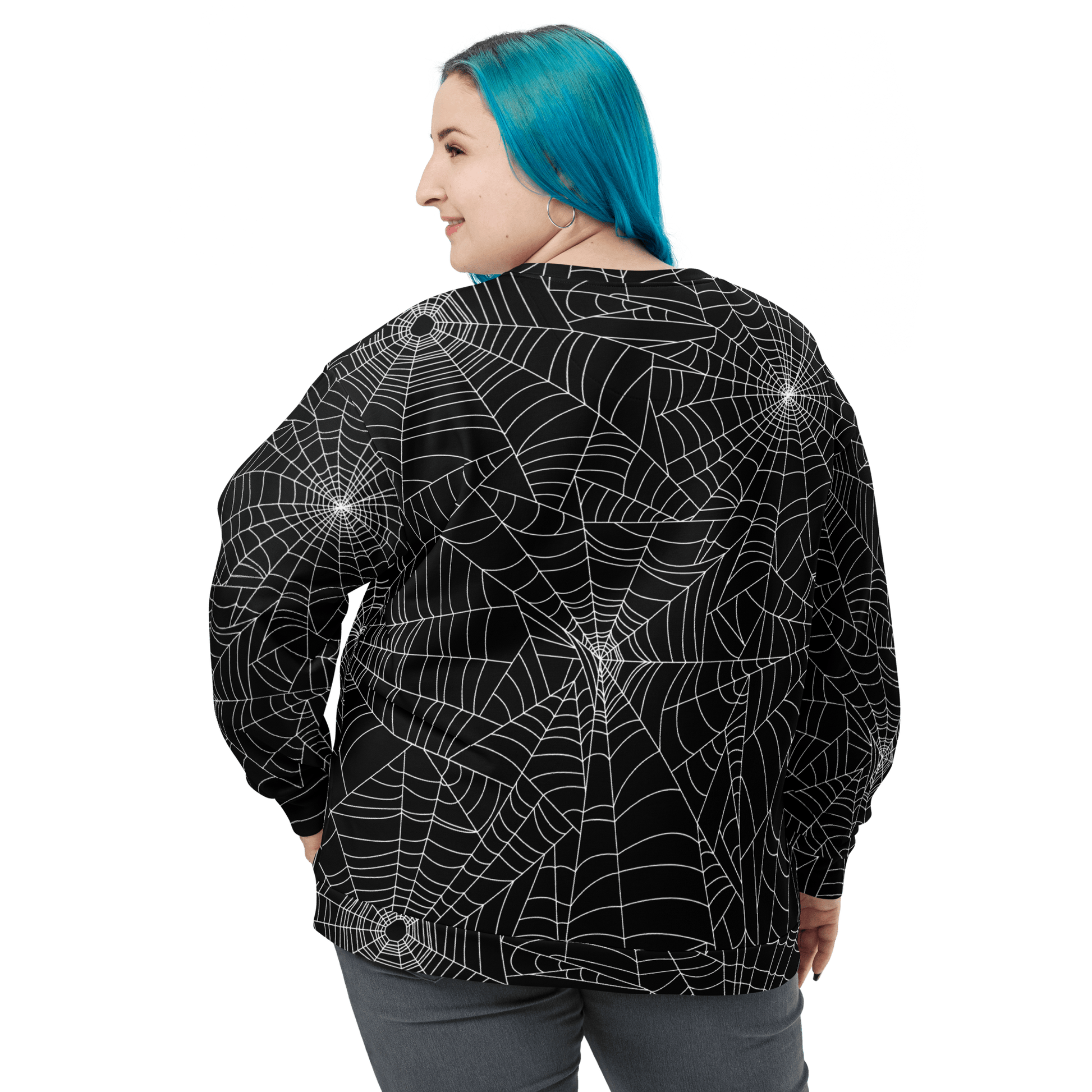 Stand out with the Web Weaver Unisex Sweatshirt, featuring a black and white spiderweb print. This unisex sweatshirt blends gothic style with comfort, making it perfect for spooky season fashion or everyday alternative wear.